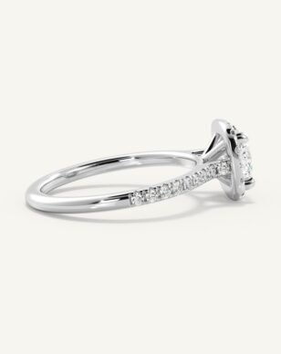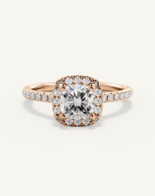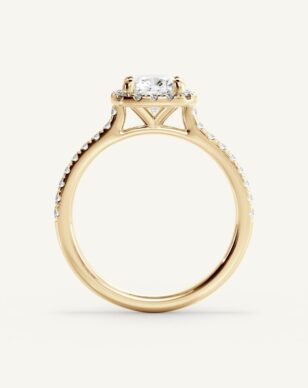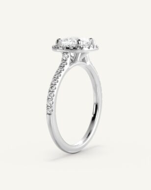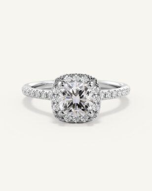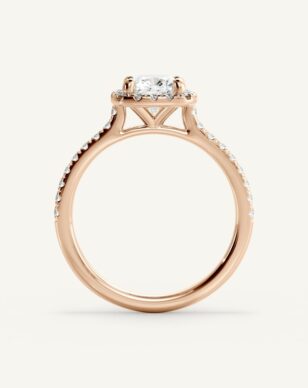 Vera-ringen med kudddiamant är en utsökt skapelse som kombinerar elegans och briljans. Den centrala kudddiamanten ramas in av en halo av små gnistrande diamanter som förstärker dess lyster och ger en mjuk, romantisk känsla. Skänkeln är delikat och pavébesatt med diamanter längs sidorna, vilket ger extra glans och en lyxig känsla.