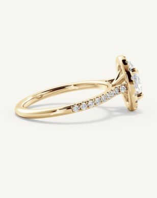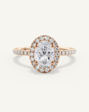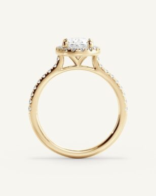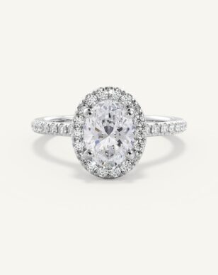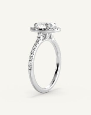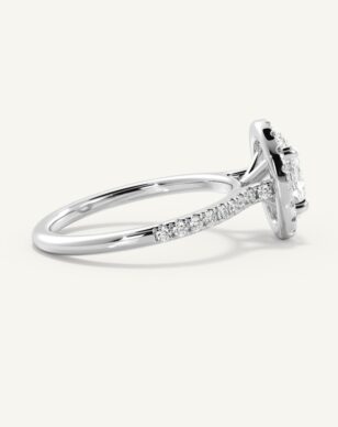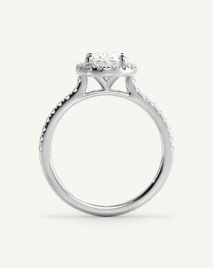 Vera-ringen med en oval slipad diamant kombinerar mjuka linjer med strålande briljans. Diamanten omges av en halo av mindre diamanter som förhöjer dess lyster och skapar en harmonisk balans mellan klassiskt och modernt. Den smala skenan är pavéinfattad med gnistrande diamanter, vilket ger extra elegans och glans. Den öppna korgen lyfter fram den ovala formen och låter ljuset reflekteras vackert genom varje fasett.