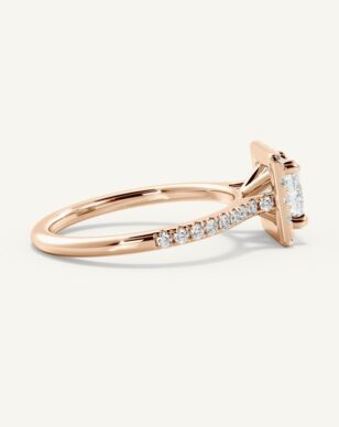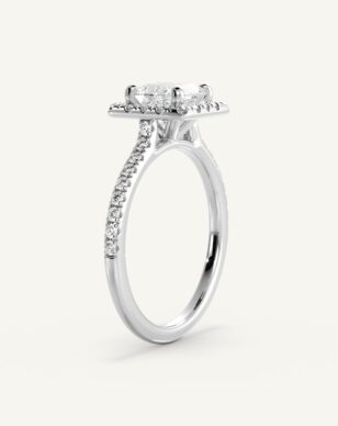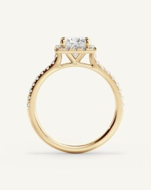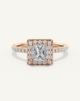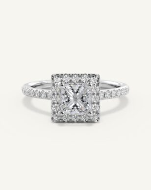 Vera-ringen med en princesslipad diamant utstrålar modern skönhet med sina raka linjer och geometriska form. Mittstenen ramas in av en gnistrande halo av mindre diamanter som framhäver dess briljans och ger ett lyxigt intryck. Den smala skenan är pavéinfattad med diamanter som tillför extra glans och elegans. Med sin öppna infattning får diamanten maximalt med ljus, vilket skapar ett strålande och levande uttryck.