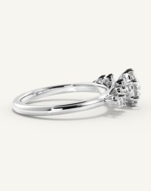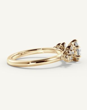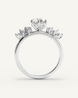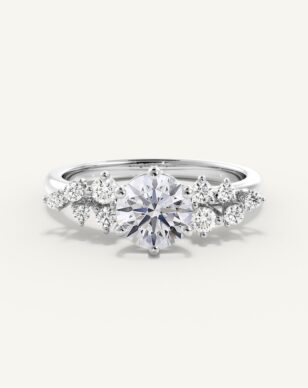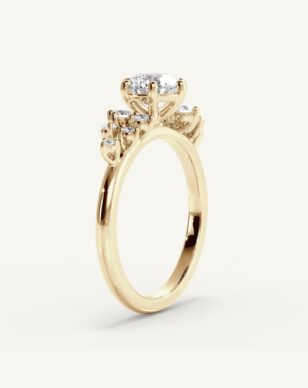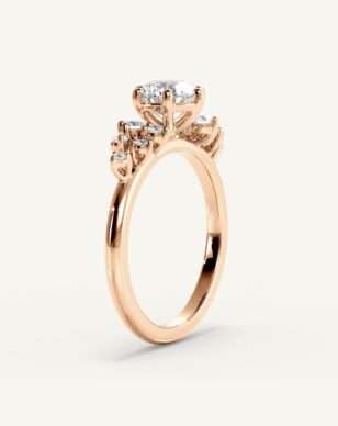 Estelle är en ring som fångar romantikens själ. Den runda mittdiamanten hålls av sex nätta klor som lyfter fram stenens briljans med enkel grace. Längs sidorna glimmar små diamanter, arrangerade som en blomsterkrans, vilket ger ringen ett levande och poetiskt uttryck. Den smala skenan ramar in helheten och gör designen balanserad och mjuk – en ring med en sagolik närvaro.