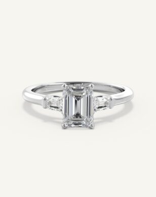 Trilogy-ring kombinerar klassisk balans med modern finess. I centrum sitter en smaragdslipad diamant som utmärker sig med sin klara lyster och djupa reflektioner. På vardera sida om mittstenen sitter avsmalnande baguetteslipade diamanter som skapar en vacker inramning och lyfter fram mittstenens briljans. Den tidlösa designen gör ringen till en symbol för dåtid, nutid och framtid – en stilfull kärleksförklaring att bära för alltid.