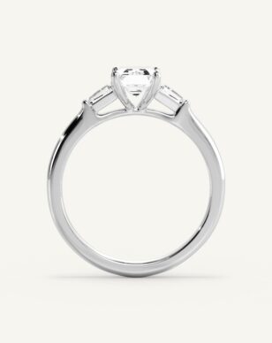 Trilogy-ring kombinerar klassisk balans med modern finess. I centrum sitter en smaragdslipad diamant som utmärker sig med sin klara lyster och djupa reflektioner. På vardera sida om mittstenen sitter avsmalnande baguetteslipade diamanter som skapar en vacker inramning och lyfter fram mittstenens briljans. Den tidlösa designen gör ringen till en symbol för dåtid, nutid och framtid – en stilfull kärleksförklaring att bära för alltid.