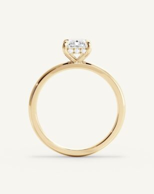 Celeste med en radiant-slipad diamant är en av våra mest omtyckta modeller, tack vare sin enkla design som framhäver stenens rektangulära form och unika briljans. Diamanten, med sina skarpa linjer och fasade hörn, sitter i en klassisk fattning som kompletteras av en “hidden halo” – en diskret rad små diamanter under stenen som tillför en extra dimension av ljus och gnista. Bandet är mjukt kupat för en bekväm och elegant känsla, och designen kan enkelt anpassas efter dina önskemål, som att välja bredden på bandet.