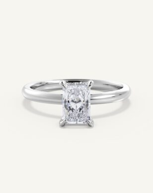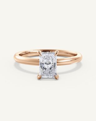 Celeste med en radiant-slipad diamant är en av våra mest omtyckta modeller, tack vare sin enkla design som framhäver stenens rektangulära form och unika briljans. Diamanten, med sina skarpa linjer och fasade hörn, sitter i en klassisk fattning som kompletteras av en “hidden halo” – en diskret rad små diamanter under stenen som tillför en extra dimension av ljus och gnista. Bandet är mjukt kupat för en bekväm och elegant känsla, och designen kan enkelt anpassas efter dina önskemål, som att välja bredden på bandet.