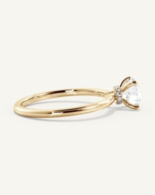 Vår populära solitärring Melanie är utformad med en tunn och elegant skena som låter diamanten ta all plats. Stenen hålls säkert av fyra klor som ger ett öppet och luftigt intryck, och underifrån finns en diskret hidden halo av små diamanter som tillför extra lyster när ringen fångar ljuset.