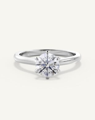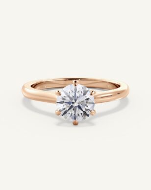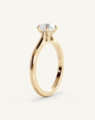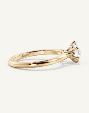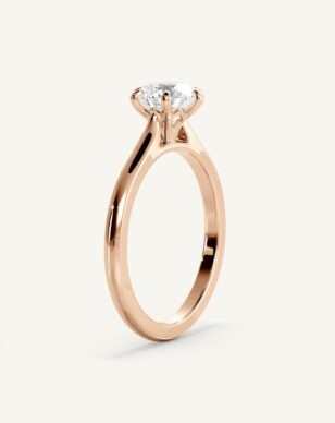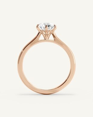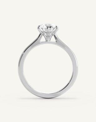Solitärring Mina har en tunn skena som smalnar av lätt mot diamanten och framhäver stenen på ett naturligt sätt. Ringen är i katedralstil där skenan lyfter sig mot stenen och möter de sex klorna. Under klorna finns en genomarbetad design med öppningar som ger ett unikt intryck och släpper in ljuset för att förstärka diamantens briljans.