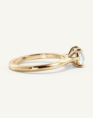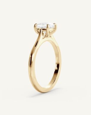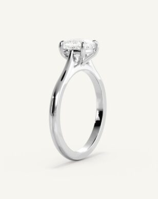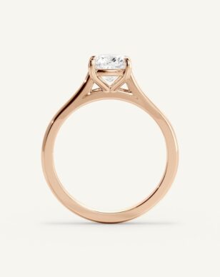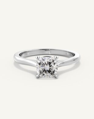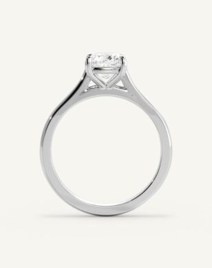 Solitärring Thea har en kudds lipad diamant som mittpunkt, vars rundade hörn och glittrande fasetter ger ett mjukt men samtidigt uttrycksfullt intryck. Stenen hålls av en fyrklofattning som lyfter fram dess form och släpper in maximalt med ljus. Den smäckra skänkeln ger en elegant siluett där mittstenen får stå i fokus. En design som förenar ren enkelhet med diskret förfining.